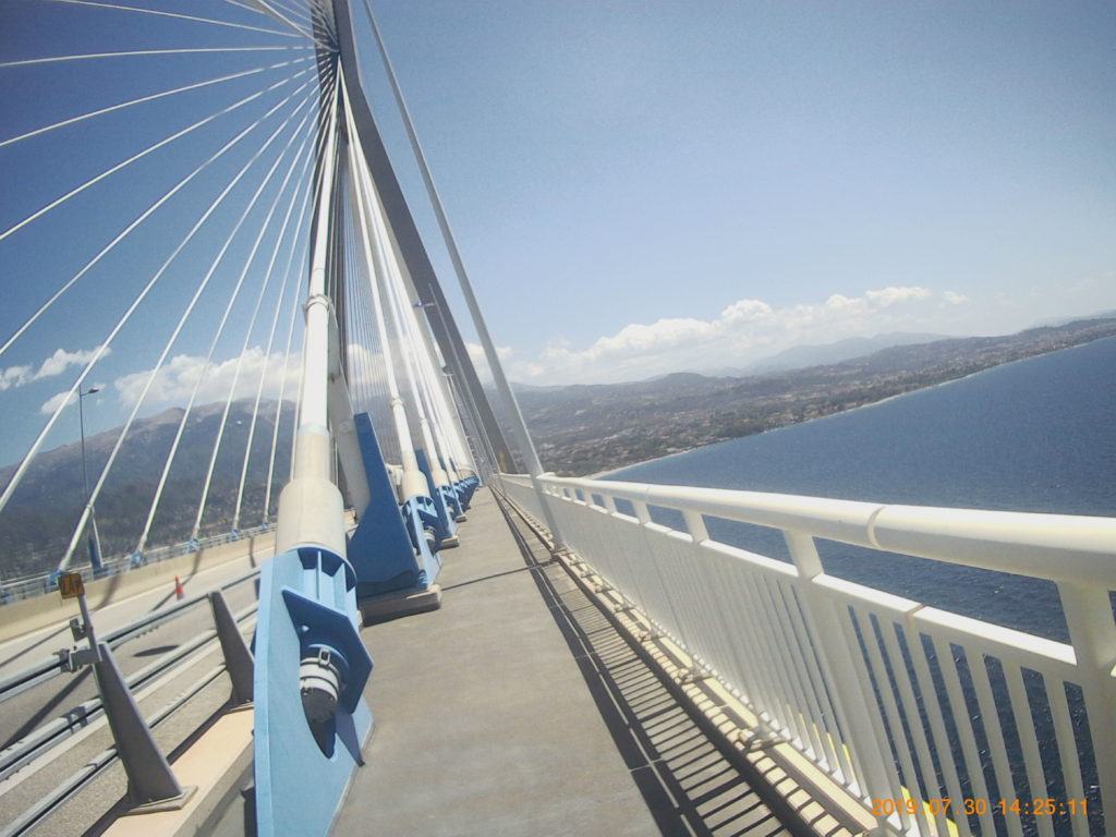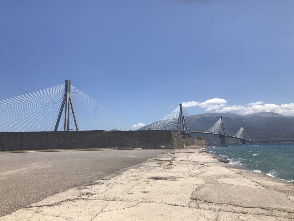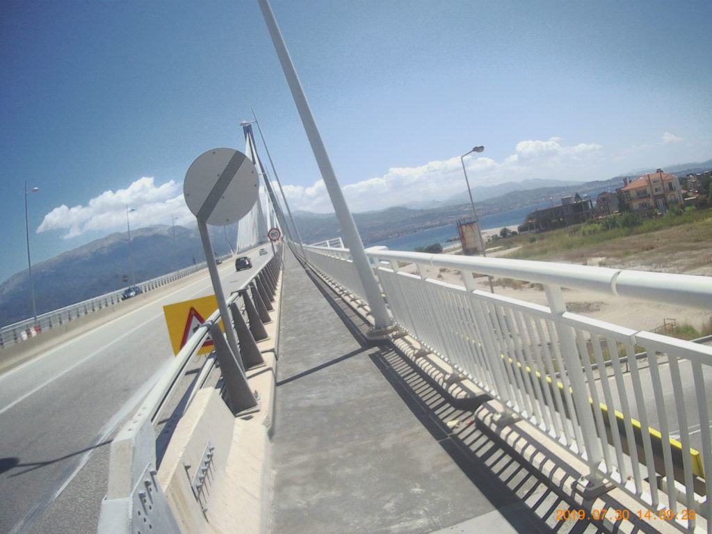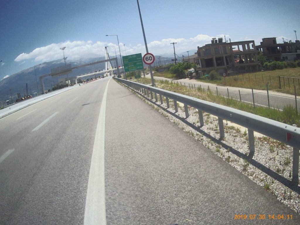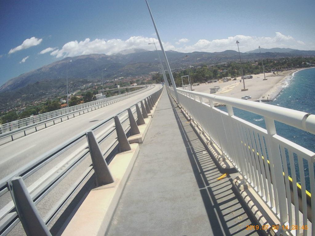 Come normalità, faccio la colazione abbondante, in hotel, due chiacchere con chi c’è in reception dove chiedo qualche info sui porti di Patrasso, una foto ricordo davanti all’hotel e si parte direzione ponte che mi porterà a Patrasso.