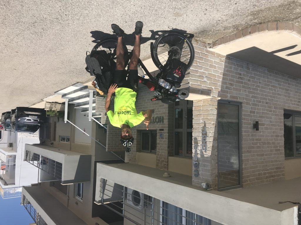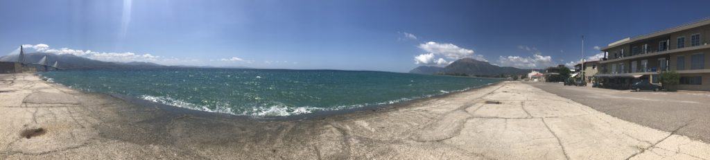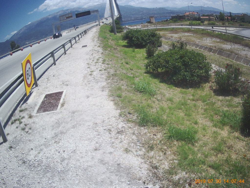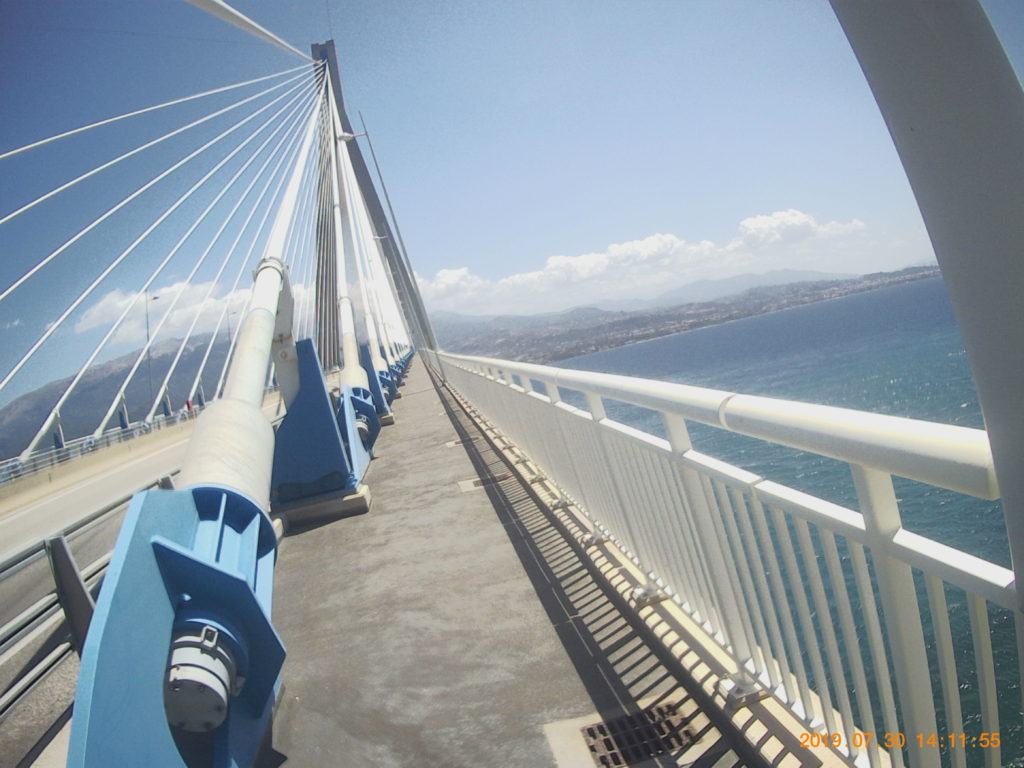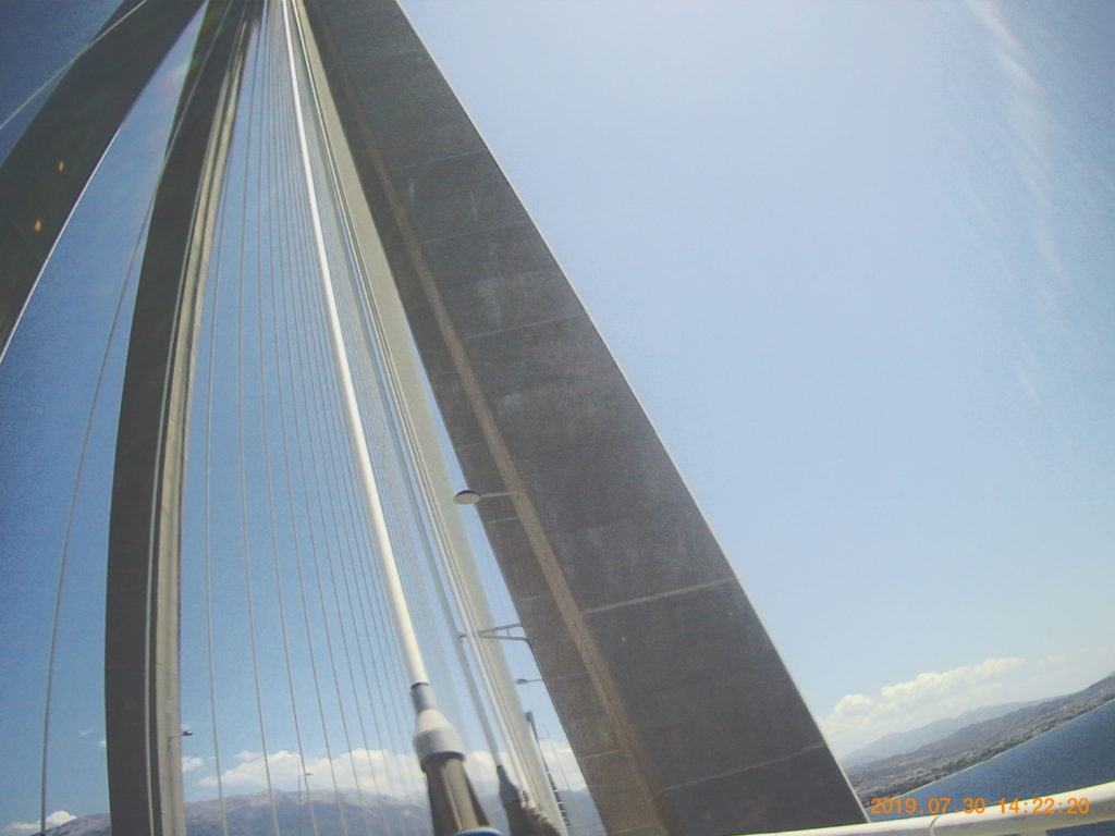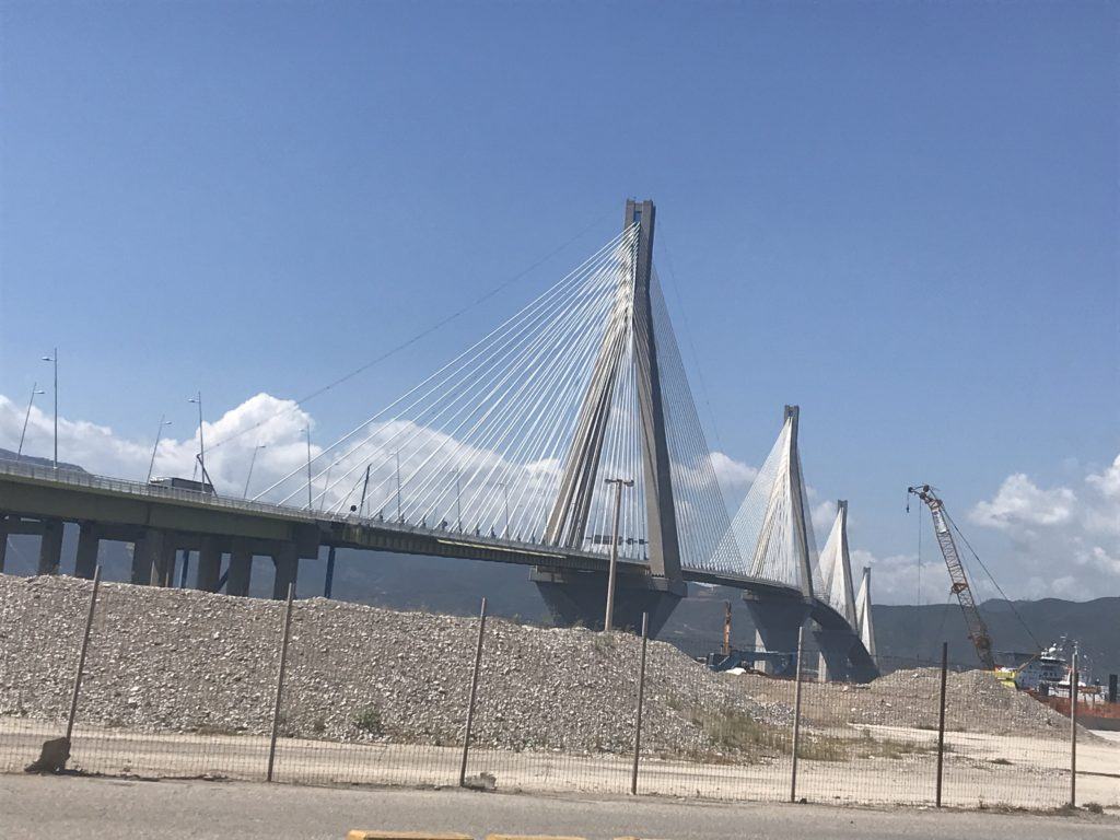 Come normalità, faccio la colazione abbondante, in hotel, due chiacchere con chi c’è in reception dove chiedo qualche info sui porti di Patrasso, una foto ricordo davanti all’hotel e si parte direzione ponte che mi porterà a Patrasso.