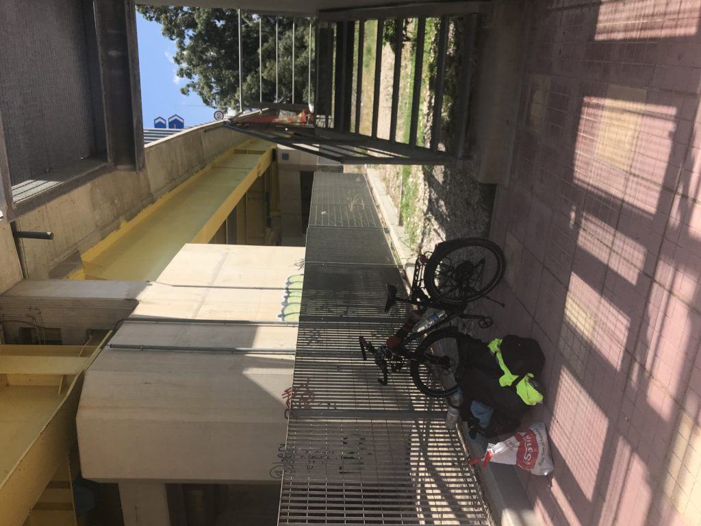 Arrivato a livello della strada, arriva dalle scale, dal lato opposto del ponte, una ragazza a cui chiedo una info. Lei è Maria ha 32 anni greca ma vive in Canada, mi racconta che è qui per assistere il padre che ha avuto un infarto, è incuriosita dal mio equipaggiamento e mi fa alcune domande. Chiacchieramo finchè non riassemblo la bici, ci facciamo una foto e poi con un sorriso si allontana. Bell’incontro è valso le scale fatte.