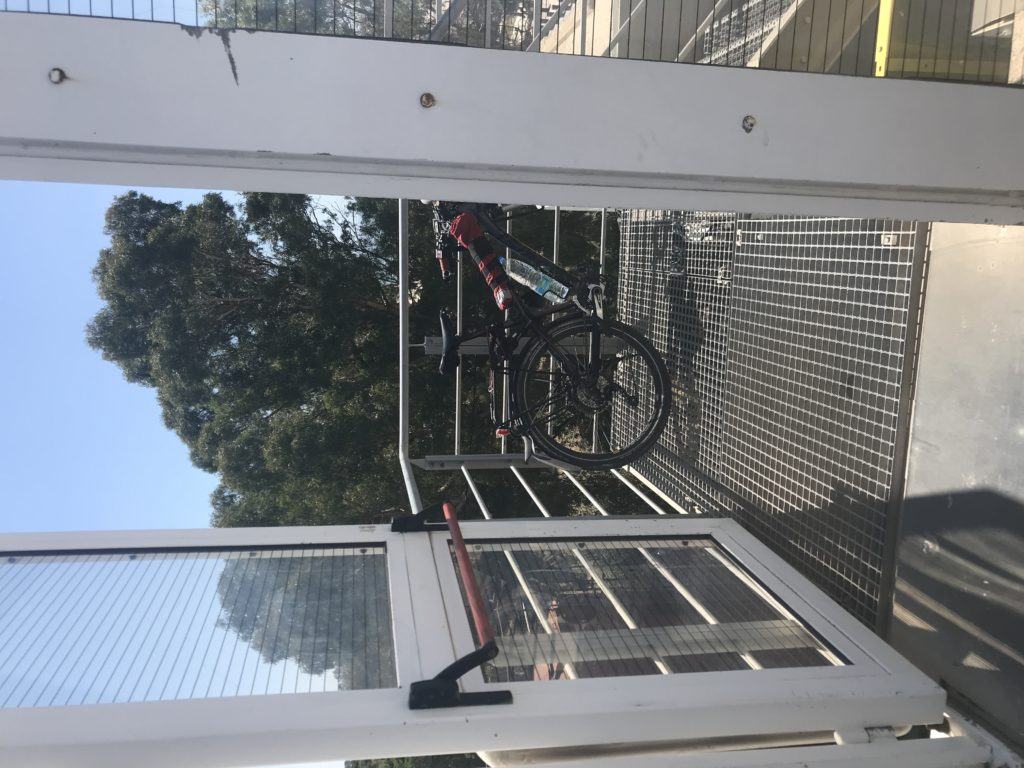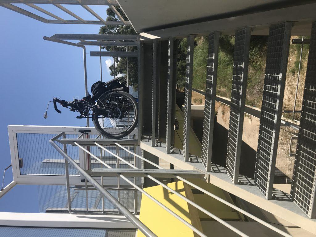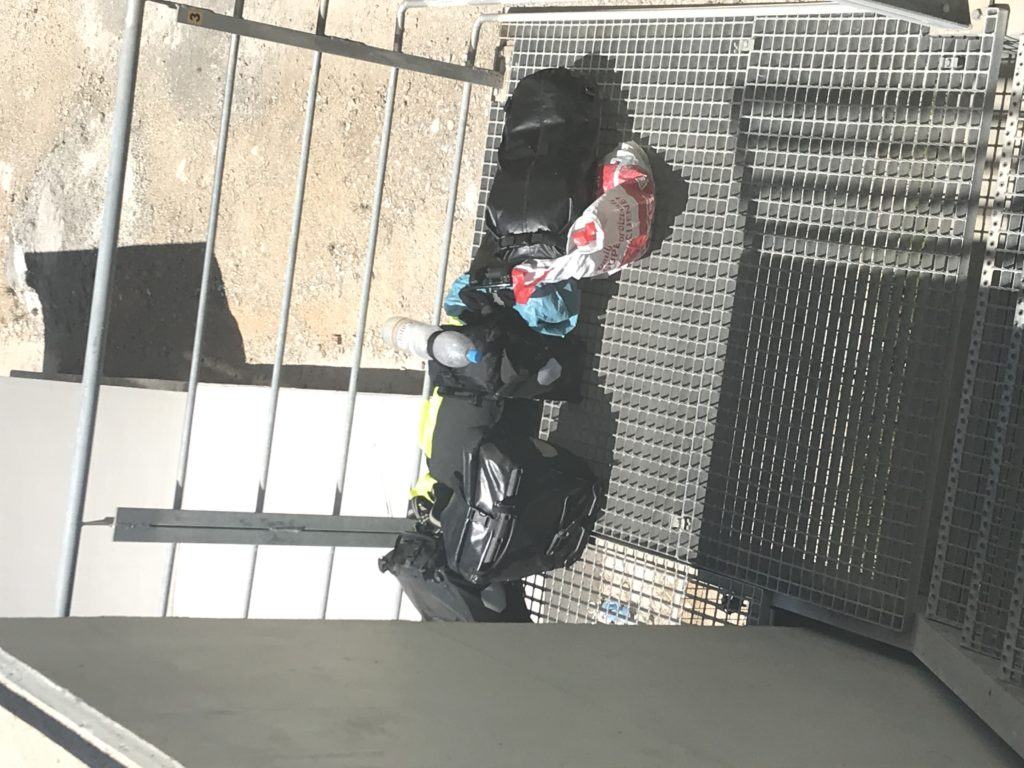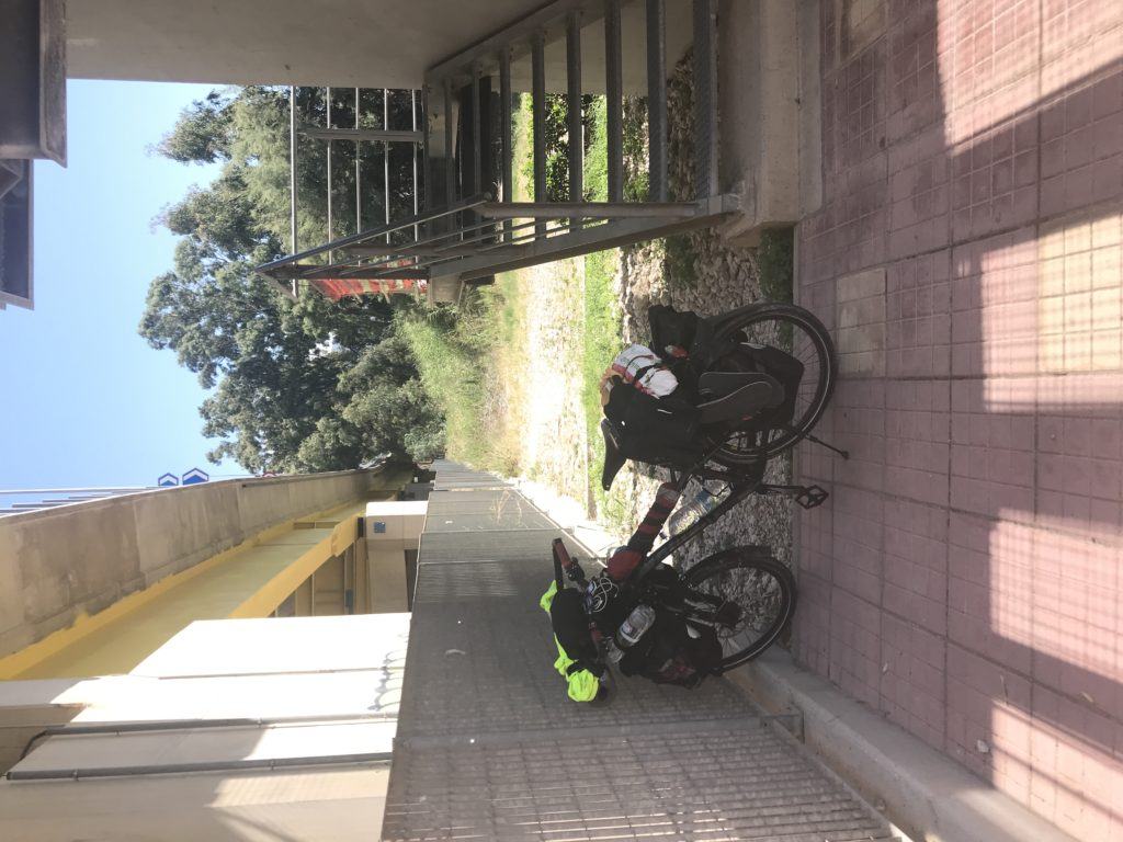 Alzare la bici oltre la barriera non è fattibile, è pesante anche da scarica, 19 kg ed io ho mal di schiena, quindi mi rimane solo da scendere le scale. Con pazienza, tanto sono in vacanza, smonto le borse e piano dopo piano porto prima le borse, poi la bici.