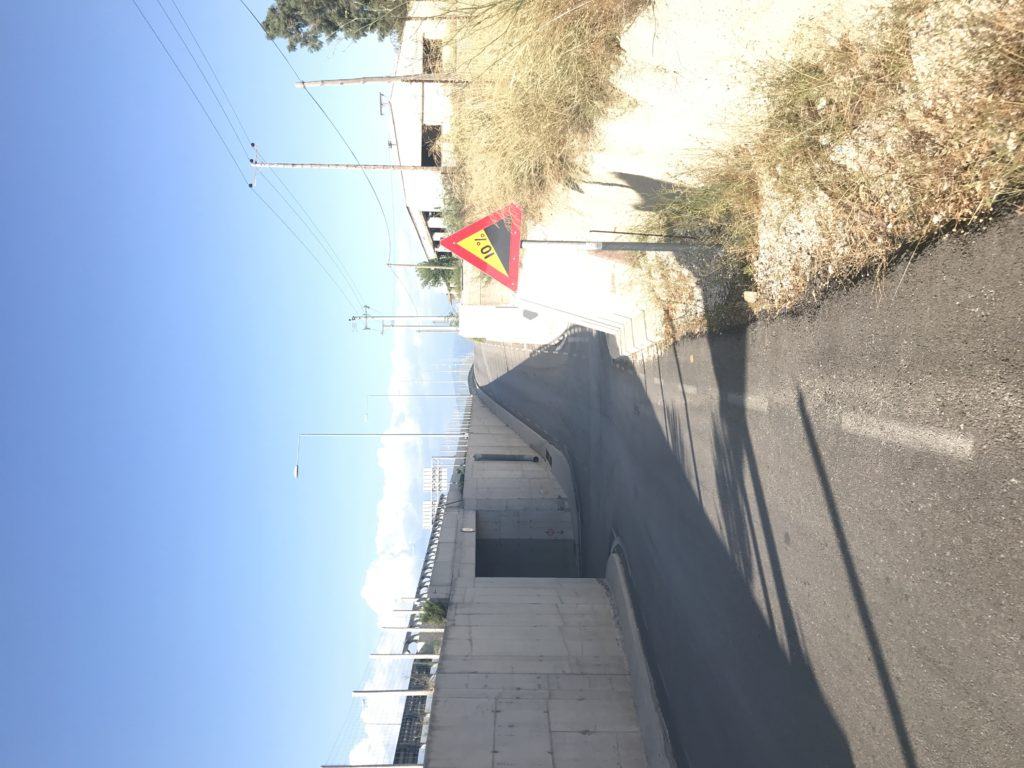 Cosí mi posiziono sulla parte dx, che lascia il passaggio agevole della bici carica e lentamente inizio il percorso, prima in salita, poi arrivo nel punto più alto e dopo in discesa. In tutto il tratto, come ovvio c’è un forte vento che tende a spostarmi. Devo tenere il manubrio con decisione per il vento e per il peso che abbinato alle borse fanno da vela con il vento quando spinge lateralmente.